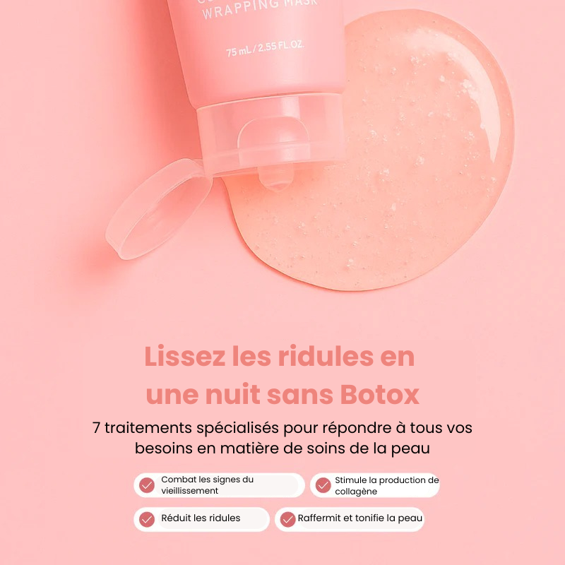 Découvrez la transformation de nuit que seule la technologie "Wrapping" coréenne peut offrir. Notre Masque de Nuit au Collagène est conçu pour prendre soin et sceller l'élasticité de votre peau pendant votre sommeil. Cette formule innovante crée un cocon micro-fin et respirant qui agit pendant 8 heures comme un traitement intensif. Contrairement aux masques de nuit traditionnels, il prévient la perte d'hydratation et permet aux actifs de travailler sans interruption.